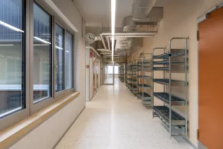 Le nouveau cantonnement AO s'implante dans le prolongement du bâtiment des officiers existant, à cheval entre les deux places d'appel du site militaire. Compact et orienté est-ouest, il assure la liaison chauffée avec le bâtiment AJ, dissocie les flux piétons et véhiculés entre les deux places et bénéficie d'un apport de lumière naturelle optimal pour les chambres et séjours. Un puits de lumière central éclaire le cœur des étages. En parallèle, le centre de subsistance BB est étendu de manière compacte à l'arrière du bâtiment existant. La structure en béton armé et béton recyclé offre modularité et faibles coûts d'entretien. Le bâtiment est certifié Minergie P-ECO : chauffage à distance 100 % renouvelable, ventilation double flux avec récupération de chaleur, panneaux photovoltaïques en toiture. Les travaux ont été conduits en site occupé et sécurisé, avec une coordination renforcée entre les intervenants.
