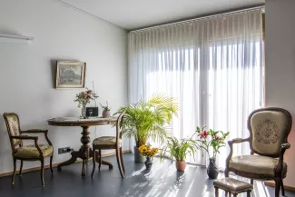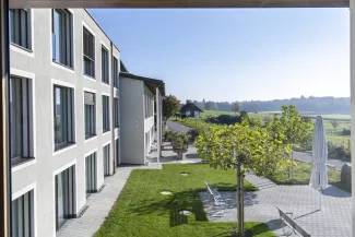 Situé en lisière de forêt sur le site d'une ancienne exploitation agricole, le home de Jeuss a été modernisé en trois étapes depuis 2016 : création d'une extension de 18 nouvelles chambres, puis rénovation des bâtiments existants en deux phases. Le nouveau bâtiment, réalisé en béton, s'insère entre les deux ailes existantes et crée une liaison chauffée à tous les étages, inexistante auparavant. Les chambres doubles ont été reconverties en chambres individuelles avec sanitaires intégrés, les anciens balcons supprimés et absorbés dans la surface habitable. L'ensemble est réalisé selon la norme Minergie : isolation renforcée, fenêtres bois-métal triple vitrage, ventilation double flux. Le concept d'éclairage suit le parcours des résidents par détecteurs, pour prévenir les chutes et optimiser la consommation.