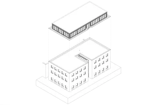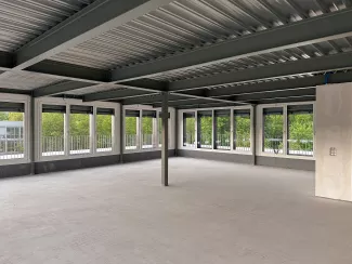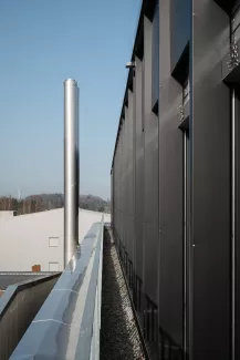 La surélévation d'un immeuble existant à Marly s'affirme volontairement comme une intervention contemporaine. Le choix du métal découle directement de la volonté du maître d'ouvrage, entrepreneur en construction métallique, de mettre en valeur son savoir-faire sur sa propre réalisation. Sa légèreté structurelle répond par ailleurs à une contrainte technique : limiter les charges transmises à la structure existante, tout en offrant un système constructif flexible, propice à la modulation des espaces intérieurs. La façade métallique marque la distinction entre les deux époques : la base en brique ancre le bâtiment dans son contexte, tandis que la surélévation en acier rend lisible la stratification de l'édifice. La trame modulaire permet d'adapter les espaces aussi bien en open-space qu'en bureaux cloisonnés.