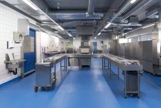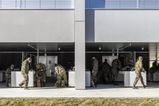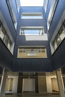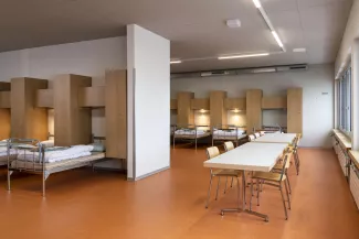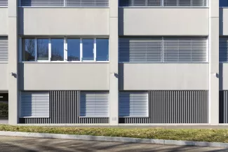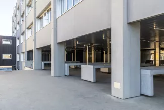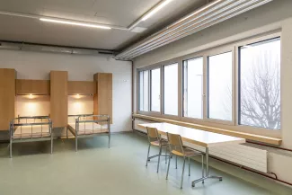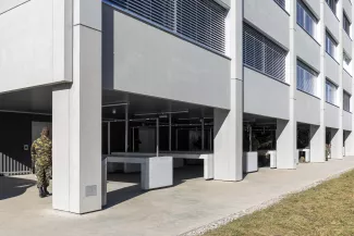 Le nouveau cantonnement AO s'implante dans le prolongement du bâtiment des officiers existant, à cheval entre les deux places d'appel du site militaire. Compact et orienté est-ouest, il assure la liaison chauffée avec le bâtiment AJ, dissocie les flux piétons et véhiculés entre les deux places et bénéficie d'un apport de lumière naturelle optimal pour les chambres et séjours. Un puits de lumière central éclaire le cœur des étages. En parallèle, le centre de subsistance BB est étendu de manière compacte à l'arrière du bâtiment existant. La structure en béton armé et béton recyclé offre modularité et faibles coûts d'entretien. Le bâtiment est certifié Minergie P-ECO : chauffage à distance 100 % renouvelable, ventilation double flux avec récupération de chaleur, panneaux photovoltaïques en toiture. Les travaux ont été conduits en site occupé et sécurisé, avec une coordination renforcée entre les intervenants.
