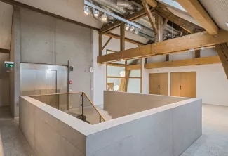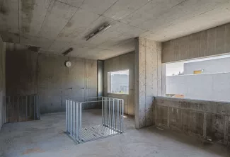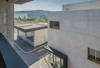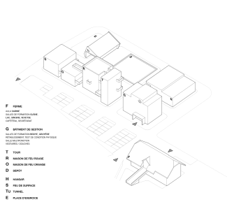 Le site s'organise comme une petite agglomération dédiée à l'apprentissage, avec ses rues, ses places et ses passerelles. Sept volumes composent l'ensemble : une tour d'exercice, deux maisons de feu, un bâtiment de gestion, un tunnel, une halle de stockage et une ferme réhabilitée qui marque l'entrée du site. Les passerelles en béton noir reliant les bâtiments servent également de supports d'entraînement pour les exercices en hauteur et en profondeur. Une matérialité sobre: béton, métal, bois, traverse l'ensemble du projet, mise en œuvre différemment selon les usages : brute dans les bâtiments d'exercice, plus soignée dans les espaces administratifs et publics.