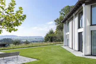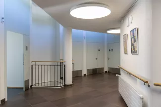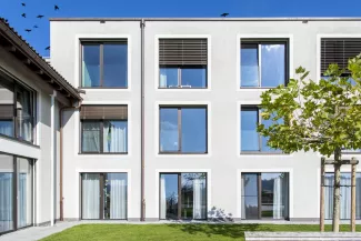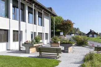 Situé en lisière de forêt sur le site d'une ancienne exploitation agricole, le home de Jeuss a été modernisé en trois étapes depuis 2016 : création d'une extension de 18 nouvelles chambres, puis rénovation des bâtiments existants en deux phases. Le nouveau bâtiment, réalisé en béton, s'insère entre les deux ailes existantes et crée une liaison chauffée à tous les étages, inexistante auparavant. Les chambres doubles ont été reconverties en chambres individuelles avec sanitaires intégrés, les anciens balcons supprimés et absorbés dans la surface habitable. L'ensemble est réalisé selon la norme Minergie : isolation renforcée, fenêtres bois-métal triple vitrage, ventilation double flux. Le concept d'éclairage suit le parcours des résidents par détecteurs, pour prévenir les chutes et optimiser la consommation.