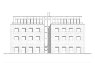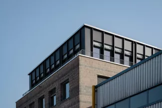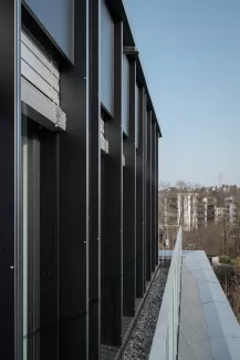La surélévation d'un immeuble existant à Marly s'affirme volontairement comme une intervention contemporaine. Le choix du métal découle directement de la volonté du maître d'ouvrage, entrepreneur en construction métallique, de mettre en valeur son savoir-faire sur sa propre réalisation. Sa légèreté structurelle répond par ailleurs à une contrainte technique : limiter les charges transmises à la structure existante, tout en offrant un système constructif flexible, propice à la modulation des espaces intérieurs. La façade métallique marque la distinction entre les deux époques : la base en brique ancre le bâtiment dans son contexte, tandis que la surélévation en acier rend lisible la stratification de l'édifice. La trame modulaire permet d'adapter les espaces aussi bien en open-space qu'en bureaux cloisonnés.